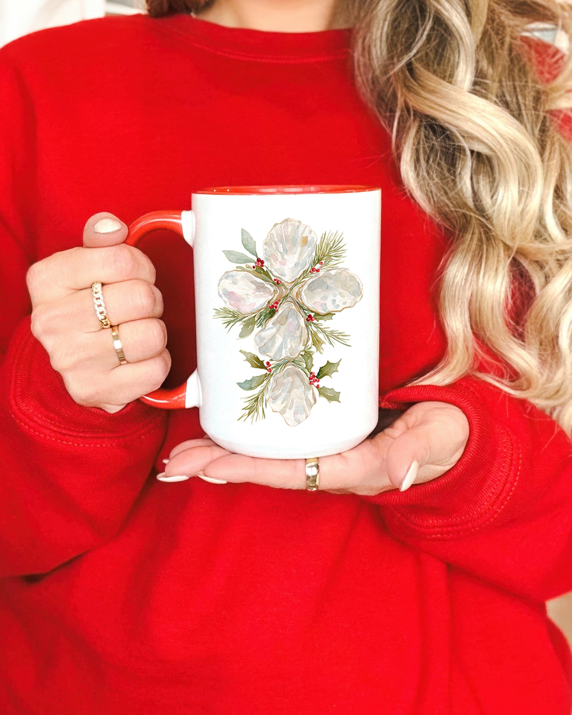 β’ Features a stunning oyster shell cross surrounded by soft coastal greenery and Christmas accents β a symbol of Southern grace and faith
