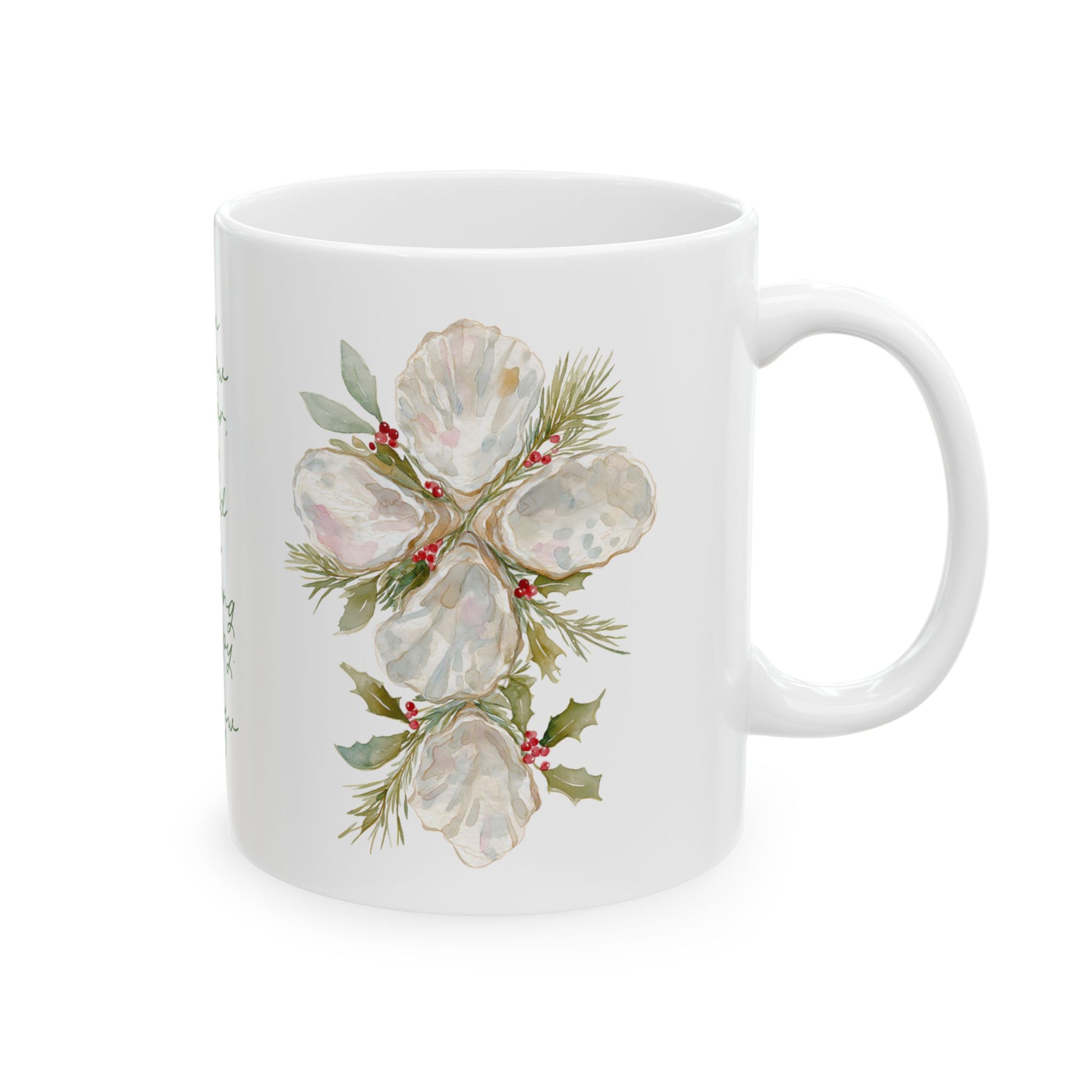 Celebrate faith and coastal charm with this Oyster Cross Christmas Mug, featuring a serene Matthew 2:10 Bible verse and elegant shell art. This coastal faith design makes a thoughtful Southern hostess gift or religious holiday dΓ©cor coffee cup, perfect for Christmas gatherings.
